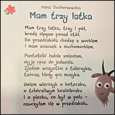 Podpowiadam więc pierwsze słowa wierszyka, który przychodzi mi do głowy: „Mam trzy latka…„. Wiem, że jeśli dobrnie do „trzy i pół„, to Dawid jej to zadanie zaliczy, a jak powie jeszcze „brodą sięgam ponad stół”, to będzie sukces. Ewa wierszyków nie mówi, jeśli już, to kończy pojedyncze wersy.