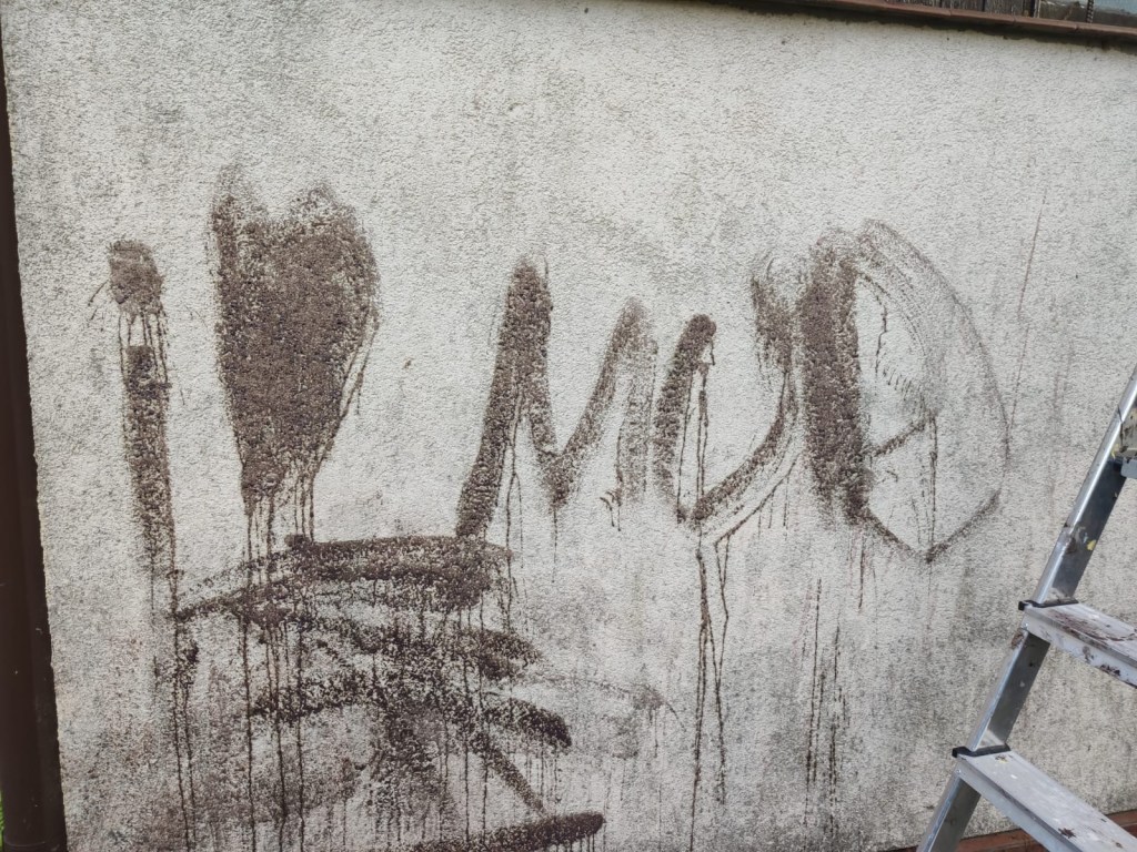 Wkrótce odkryliśmy jeszcze jedno jej dzieło, wymalowane na ścianie domku pędzlem, który najwyraźniej nie był do końca wypłukany po ostatnim malowaniu płotu.